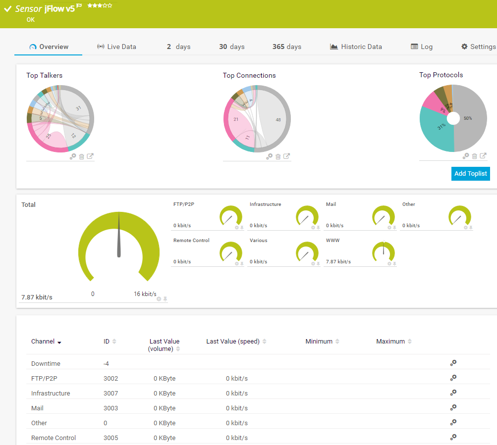 i_round_blueFor all Flow (NetFlow, jFlow, sFlow, IPFIX) and Packet Sniffer sensors, Toplists are available on the sensor's Overview tab. Using Toplists, you can review traffic data for small time periods in great detail.