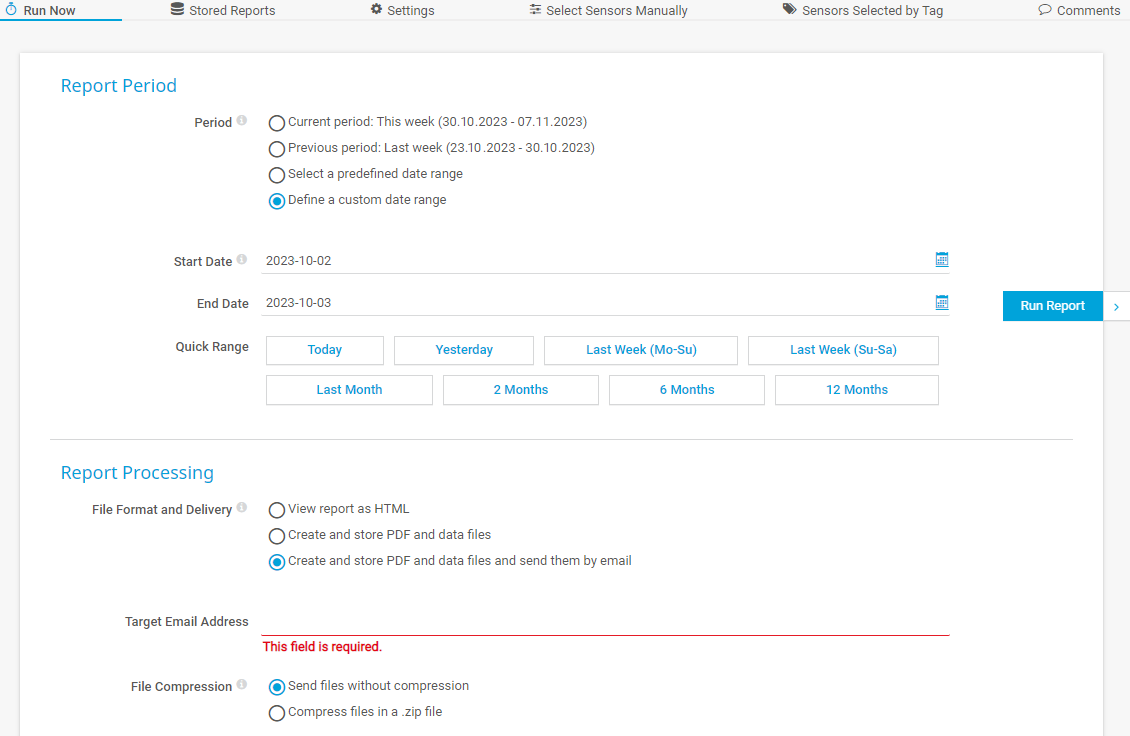 Click Run Report to start the report generation. Depending on the number of selected sensors, this might take a while. If it takes a long time to generate HTML reports, consider using one of the PDF options.